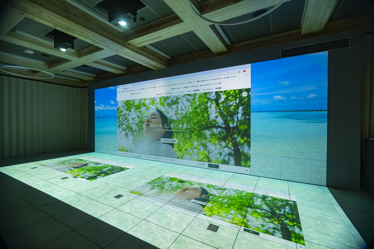 花王株式会社は、1887年の創業以来、130年以上にわたり日本を代表する化学・日用品メーカーとして、人々の暮らしに寄り添い続けてきた企業です。「豊かな共生世界の実現」をパーパスに掲げ、サステナブルで高品質な製品・サービスを通じて、人と社会、地球の豊かな未来に貢献することを使命としています。 2025年11月18日、同社が東京・墨田の「花王すみだ事業場」内に新設したのが、トレーニングセンター「佑啓」です。佑啓の原点は、1998 年にすみだ事業場内に開設された「佑啓塾」にあります。その名には 「先人の歩まれた道に佑(たす)け啓(みちび)かれ 自らを啓(ひら)き、共に高め合い 更なる花王の発展を期する場」という想いが込められています。 今回イマーシブは、この「佑啓」の2階の2ヶ所に Immersive Engine と Immersive Magic Wall を導入。没入感のあるデジタル映像に囲まれながら、研修・ワークショップ・プレゼンテーションを行える環境を構築しました。 End Client : 花王株式会社 Partner : リコージャパン株式会社 ■ 導入前の課題 花王さまが求めていたのは、“明るい環境でも映像や資料がはっきり見えるプロジェクター空間”でした。従来のプロジェクターでは照度を保つと映像が白っぽくなり、細かな資料の視認性に課題がありました。改善策を検討する中で、花王のご担当者さまが恵比寿のイマーシブショールームを訪問。 空間の明るさを落とさず、高コントラストを実現するImmersive Magic Wallの映像体験に驚き、佑啓に最適なソリューションとして導入を決定しました。